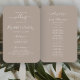 Ce ventilateur de programme de mariage moderne présente un script blanc et un texte sans serif sur un arrière - plan taupe.