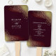 Le "Starry Night Deep Crimson Wedding Program Hand Fan" offre une touche unique et pratique aux programmes de mariage traditionnels. Conçu avec un arrière - plan riche et profond et trempé de poussière d'étoile dorée qui rappelle un ciel nocturne brillant, ce ventilateur à main est un ajout éclatant à votre cérémonie. Chaque fan décrit la progression des événements, de l'introduction aux voeux, en s'assurant que les invités peuvent suivre tout en restant cool et confortables. Ce gardien fonctionnel allie élégance et utilité, ce qui en fait non seulement un guide de votre cérémonie mariage, mais aussi un souvenir chéri de votre soirée enchantée sous les étoiles.