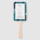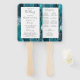 This elegant, modern wedding program fan features a teal blue agate background trimmed with rose gold faux glitter. The text appears in elegant rose handwriting and copperplate fonts on a white rectangle.