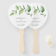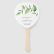 Ventilateur à main mariage rustique avec un design simple avec une aquarelle verte peinte avec de grands feuilles, sur un arrière - plan blanc. Voici vos détails dans un gris doux. Un design botanique élégant qui est parfait pour une fête en été.