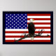 Ein Bald-Adler scannt den Himmel von seiner Terrasse auf einem Baumzweig, überlagert auf einer Fahne der Vereinigten Staaten.