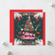 Das ist ein fröhliches Weihnachtsdesign mit goldenem Weihnachtsbaum, Weihnachtsbeleuchtung, Schneeflocken und dunkelgrünem Hintergrund mit tausenden Sternen.