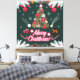 Das ist ein fröhliches Weihnachtsdesign mit goldenem Weihnachtsbaum, Weihnachtsbeleuchtung, Schneeflocken und dunkelgrünem Hintergrund mit tausenden Sternen.