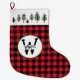 This stocking design has a red and black check pattern, with a boarder of evergreen trees, at the top. In the center, there’s a monogram with a name, which can be customized.