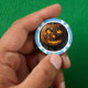 Sinister Lächeln: Eine bedrohliche Jack-o'-Laterne starrt aus einer spöttischen Friedhofszene heraus, deren feuriges Glühen die Dunkelheit eines Halloween-Vollmond-Abend durchbricht.
