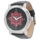 Diese dramatische Armbanduhr zeichnet sich durch ein schwarzes Gesicht mit grauen Zahlen und eine atemberaubende rote Medaille aus.