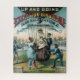 Circa 1885 - Werbung für Ginger Ale mit Ballon und Korb mit schwarzen Begleitern. Zwei Frauen trinken Excelsior Ginger Ale, was impliziert, dass der Kohlenstoff hilft der Ballon zu steigen. Bild von zwei modisch gekleideten Frauen in schlanken, langen Kleider und Knöcheln, die auf einer Heißluftballonfahrt starten, eine steht im Korb und hält ein spitzengeätztes Taschentuch mit einem senfliegenden Ballonfahrer mit Fernglas und einem Monokel, die andere sippt eine Insignatur aus Glas, während sie beginnt, eine Seilleiter in das Handwerk zu steigen; zwei afroamerikanische Männer mit Gale Ein großer Menschenmassen beobachtet das Spektakel hinter einem weißen Holzzaun, der mit Werbeslogans bemalt ist