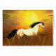Cheval Buckskin avec un léger effet abstrait numérique ajouté à sa photo court libre à travers un champ de haute herbe brune avec le coucher ou soleil levant dans l'arrière - plan