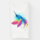 Heller, schillernder, exotischer, fliegender Kolibri auf weißem Hintergrund, übermalt mit mehrfarbiger Aquarellfarbe. Regenbogen-Kolibri.