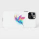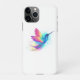 Heller, schillernder, exotischer, fliegender Kolibri auf weißem Hintergrund, übermalt mit mehrfarbiger Aquarellfarbe. Regenbogen-Kolibri.