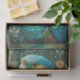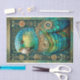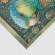 A richly detailed parrot portrait of a bright blue and green bird adorned in ornate steampunk accessories. The parrot’s feathers transition from aqua to emerald and deep teal. Around its neck rests an elaborate metallic collar set with embellishments, blending natural beauty with intricate mechanical design. Surrounding the bird is a coordinating background of scrollwork and stylized medallions, all in gold tones. Artwork similar to a digitally painted fantasy illustration…..COLOR COMBINATIONS: Teal, turquoise, emerald green, brass, ochre, and navy…..PERFECT FOR:
