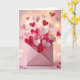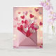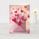 Ein rosa Umschlag überströmt mit Papierherzen in verschiedenen Rot-, Rosa- und Weißtönen, Set mit sanft verschwommenem Hintergrund und leuchtenden Lichtern. Text kann geändert werden.