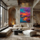 Colorful expressionist skyline artwork inspired by Sydney featuring the famous Opera House and Harbour Bridge reflected in the harbor at sunset. Bold textures and vibrant colors create a dramatic coastal cityscape painting full of atmosphere, perfect for lovers of Sydney and modern expressionist city art.