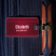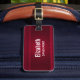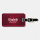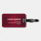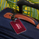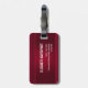 Personalisierter Gepäckanhänger mit rotem Hintergrund mit eleganten Wirbel und Ziermotiven an den Rändern.