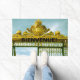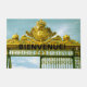 Farbiges Foto eines extravaganten goldfarbenen antiken Tors auf einer Begrüßungsmatte.