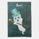 Dieses Küchenhandtuch hat einen extravaganten, weißen Geist mit einem blauen Hut mit Goldschnitt und einem verzierten schwarzen, goldgetrimmten Stock, der mit einem goldenen Schädel überzogen ist, der in einem dunklen schwarzen Nachthimmel schwebt. Passen Sie den Boo!-Text mit der Vorlage an.