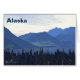 Montagnes bleues, eau du lac bleu, arbres vert foncé, algues roses et couvert. Une représentation de l'été dans l'extrême nord. Le texte "Alaska" apparaît également. Mosquitos non inclus.