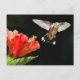 Ein Kolibri nähert sich einer hellroten Hibiskus-Blume, um einen Nektar zu bekommen.