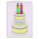 Zwei Cartoon-Stuben, die auf einem mehrstufigen Hochzeitskuchen fabelhaft stehend gekleidet sind. Das Bild hat einen pastellfarbenen Hintergrund.