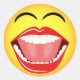 Gesicht - SYFE100 © Sonnenanbeter Mars Designs. Diese coolen, humorvollen, lustigen, neuartigen Rundaufkleber zeigen ein lustiges Bild eines gelben lachenden Gesichtsemotikons mit offenem Mund, weißer Perlenzähne, Zunge und geschlossenen Augen. Konzept für den Spaß.