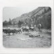 Cowboys zu Pferd, die eine Gruppe Satzmaultiere über einem Fluss auf der Heugabel-Ranch nahe Meeteetse, Wyoming fahren.