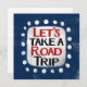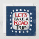 "Let's Take A Road Trip" ist ein niedliches Textdesign in blau mit schwarzem und rotem Text. Die Wörter sind in weißer Akzent-Form, umgeben von niedlichen weißen, weißlichen, weißlichen Punkten, gehalten.