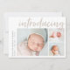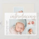 Une carte faire-part de naissance élégante et moderne avec trois photos (une carré et deux horizontales), avec "introduction" en haut dans la typographie de script de brosse à lettres à la main. Personnalisez avec le nom de votre bébé et les statistiques de naissance sur le côté gauche. Ajoutez un message personnel à l'arrière, ainsi qu'une photo supplémentaire.