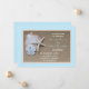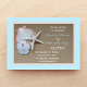 Ce faire-part d'élévation est illustré d'une photo d'un coquillage, d'un dollar d'étoiles de mer et de sable sur un arrière - plan de burlap. La photo est entourée de blanc, pêche et bleu. Ce faire-part d'élopement peut être customisé pour inclure vos détails d'elopement. Copyright henishouseo