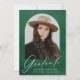 Élégant faire-part de graduation avec la photo du diplômé à l'intérieur d'une arche avec un arrière - plan d'aquarelle verte. "Graduate" est affiché dans un script de calligraphie moderne blanc avec le nom du diplômé, l'école, et l'année d'études montré ci-dessous. La faire-part de graduation de la photo s'inverse pour afficher 6 photos carrés dans une mise en page de type grille.