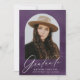 Élégant faire-part de graduation avec la photo du diplômé à l'intérieur d'un cadre d'arche avec un arrière - plan d'aquarelle violette. "Graduate" est affiché dans un script de calligraphie moderne blanc avec le nom du diplômé, l'école, et l'année d'études montré ci-dessous. La faire-part de graduation de la photo s'inverse pour afficher un arrière - plan d'aquarelle violet assorti avec de l'espace pour du texte et des photos supplémentaires.