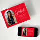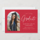 Faire-part tendance de remise des diplômes avec la photo du diplômé encadrée par une arche rouge avec "Graduate" dans une écriture manuscrite blanche. Personnalisez l'avant de la carte de faire-part de remise de diplômes en arc en ajoutant le nom du diplômé, l'année de remise de diplômes, le nom de l'école et les plans futurs. La faire-part de graduation de la photo s'inverse pour afficher un motif pointillé rouge et blanc. Le faire-part convient aussi bien aux diplômés du secondaire qu'aux diplômés du collégial.