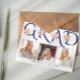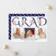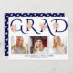 Bleu marine et blanc GRAD typographie rose roses photo graduation faire-part. Il comporte le mot "GRAD" dans une police décorative en bleu marine, des bouquets de roses roses et trois photos. Le côté arrière est doté d'un motif de bouchons blancs de graduation sur le bleu.