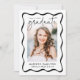 Célébrez votre jalon avec ce faire-part de graduation Black Wavy Frame moderne, avec un design élégant et élégant. L'avant présente une photo verticale encadrée d'une bordure en noir ondulé, avec "Graduate" élégamment affichée dans un script noir manuscrit sur un arrière - plan blanc immaculé. Personnalisez-le avec votre nom, votre année de diplôme et votre école pour une touche unique. L'arrière du faire-part met en évidence une photo horizontale avec espace pour un message personnalisé, vous permettant de partager votre enthousiasme et vos projets futurs. Parfait pour les diplômés du secondaire et du collège, ce design moderne et intemporel fait un souvenir mémorable pour la famille et les amis.