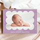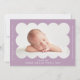 Faire-part de naissance simple et moderne avec la photo de votre bébé nichée à l'intérieur d'un cadre à pétoncles violet clair. Personnalisez le faire-part de naissance violet en ajoutant le nom de votre bébé et des informations supplémentaires en lettres blanches. L'arrière de la carte présente un motif de rayure minimaliste violet et blanc.