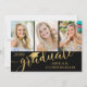 Faire-part de graduation de collage photo moderne avec 3 photos sur l'avant et 1 sur le dos avec typographie de script de calligraphie or métallique pour le titre GRADUATE accentué avec une casquette de graduation ou mortier et personnalisée avec le nom de votre diplômé et l'année de classe contre un arrière - plan noir modifiable - sélectionnez une couleur différente ou choisissez parmi une variété de modèles graphiques arrière - plans. Le dos contient des détails sur votre diplômé. ASSISTANCE : Pour obtenir de l'aide sur la modification/personnalisation de la conception, le transfert de la conception à un autre produit ou si vous souhaitez coordonner des éléments, contactez le concepteur AVANT DE COMMANDER via Zazzle Conversation ou makeitaboutyoustore@gmail.com.