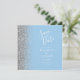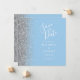 Le bord gauche de cet élégant mariage moderne, à l'exception de la carte de date, comporte une bordure en faux parties scintillant argent. Le texte personnalisable combine écriture blanche, copperplate et polices italiques sur un arrière - plan bleu bébé pastel. L'envers est assorti d'un design bleu bébé et argent.