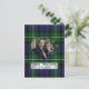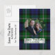 Élégante carte postale de sauvegarde de date de mariage avec photo, réalisée dans le traditionnel vert Forbes et le tartan bleu. Une découpe en forme de cœur pour votre photographie, au milieu du motif à carreaux, avec une plaque en métal argenté en dessous et un texte en vert. Tout le texte, sur la plaque avant et au verso de la carte, est entièrement personnalisable pour dire ce que vous voulez.