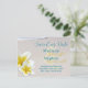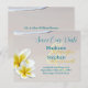 Cartes postales de mariage de destination sur le thème tropical à conserver. Annonces de mariage abordables avec des modèles pour toutes les informations, y compris les informations de voyage et d'hébergement. Fleurs de plumeria sur du sable de plage et texte de modèle imprimé.