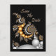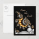Design élégant pour les vœux "Réservez la date". Des perles argentées, dorées et blanches avec des détails complexes spiralent sur un fond noir. Des lettres argentées et dorées biseautées écrivent "Réservez la date".