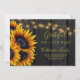 Moderne rustique élégant Thanksgiving famille vacances déménagement carte avec un beau bouquet de tournesols orange or jaune et un script de typographie or chic sur un pays rustique arrière - plan de grange brun foncé avec des lampes à cordes.