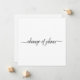 Cette carte élégante est conçue pour tenir vos invités informés si vous êtes dans la malheureuse position d'avoir à annuler ou reporter votre mariage. Le design simple noir et blanc présente une calligraphie scripturale indiquant "changement de plans" sur le devant, et un espace pour une note personnalisée et une signature au dos.