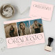 Ce faire-part moderne de trois diplômes de photographie présente une élégante typographie "graduée" en gris foncé avec trois photos sur un arrière - plan rose vif. À l'arrière il y a le texte d'invitation pour la fête de remise de diplômes / open house qui peut également être supprimé si pas nécessaire. Les couleurs Arrière - plan et texte sont personnalisables. Ce design simple mais élégant permet vraiment à vos photos de briller en gardant les détails minimes.