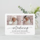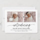 Carte de naissance chic et moderne avec 2 photos à l'avant et 4 photos au dos de la carte. Écriture "présentation" liée à un cœur. Typographie moderne et classique.