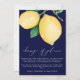 Devez-vous reporter votre mariage ? Envoyez cette annonce de changement de plans à vos invités. Cette annonce présente des citrons jaunes à l'aquarelle et des feuilles vertes, faisant allusion à l'expression populaire "quand la vie vous donne des citrons, faites de la limonade". Le fond est d'un bleu marine saisissant, avec "changement de plans" en calligraphie moderne blanche, et votre message en police sans empattement blanche.