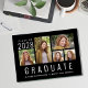 Faire-part moderne minimaliste de graduation noire pour lui ou elle avec un collage photo de 5 images et "Graduate" écrit sur le fond dans de grandes majuscules blanches. Ajoutez son année de classe, son nom et son école ou université en simple typographie blanche.