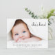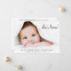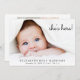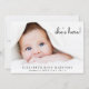 Faire-part de naissance photo simple pour annoncer l'arrivée de votre bébé à la famille et les amis. La photo de votre nouveau-né remplit le devant et est superposée de "elle est ici !" "il est ici !" ou "Je suis ici !" dans un script contemporain (vous pouvez déplacer ce texte dans une autre zone de la carte pour convenir à votre photo en sélectionnant l'édition dans l'outil de design). Ajoutez son nom, sa date d'arrivée et ses statistiques de naissance. Au contraire, ajoutez quatre photos supplémentaires, un message "accueilli par" et les prénoms des parents et des frères et soeurs.
