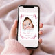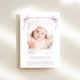 Une carte douce pour annoncer la naissance de votre petite fille avec sa photo sous des aquarelles roses douces de rubans délicats et des arcs de coquette, mélangeant une esthétique minimale avec une touche de charme vintage fantaisiste. Son nom est présenté dans un élégant script rose et ses statistiques d'anniversaire et de naissance sont dans la typographie serif classique. Au verso, ajoutez une photo supplémentaire et votre message personnalisé à votre famille et à vos amis.