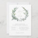 Belle couronne de feuillage botanique à l'aquarelle dans des tons de sauge poussiéreuse, invitation de mariage. Design typographique moderne et chic gris et sauge. Le dos de la carte présente une couleur unie en vert sauge poussiéreux, qui peut être personnalisée.