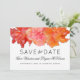 Faire-part de mariage à l'hibiscus orange pour un mariage sur le thème tropical hawaïen. Trois fleurs d'hibiscus exotiques de couleur rose foncé, rose clair et orange forment une large bordure en haut de cartes blanches avec du texte noir et de l'espace pour inclure les noms complets du couple.