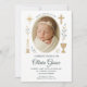 Célébrez le jour spécial de votre bébé fille avec ce faire-part de baptême élégant et personnalisable. Caractéristiques d'une palette de couleurs neutres douces avec des symboles religieux dorés dessinés à la main — croix, bougie, calice — et un cadre photo ovale centré. Un design intemporel parfait pour les cérémonies modernes ou traditionnelles.
